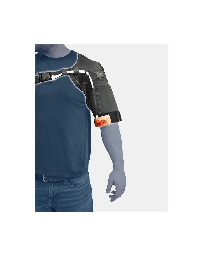 Grâce à ce simulateur, simulez une hémorragie par objet tranchant ou arme à feu. L’apprenant pourra poser un garrot sur la victime simulée pour arrêter l’hémorragie. Une simulation aussi vraie que réelle.Le brassard se met sur le bras et s’utilise avec le sang simulé grâce à un raccord rapide permettant de faire circuler le sang depuis la réserve située à proximité.